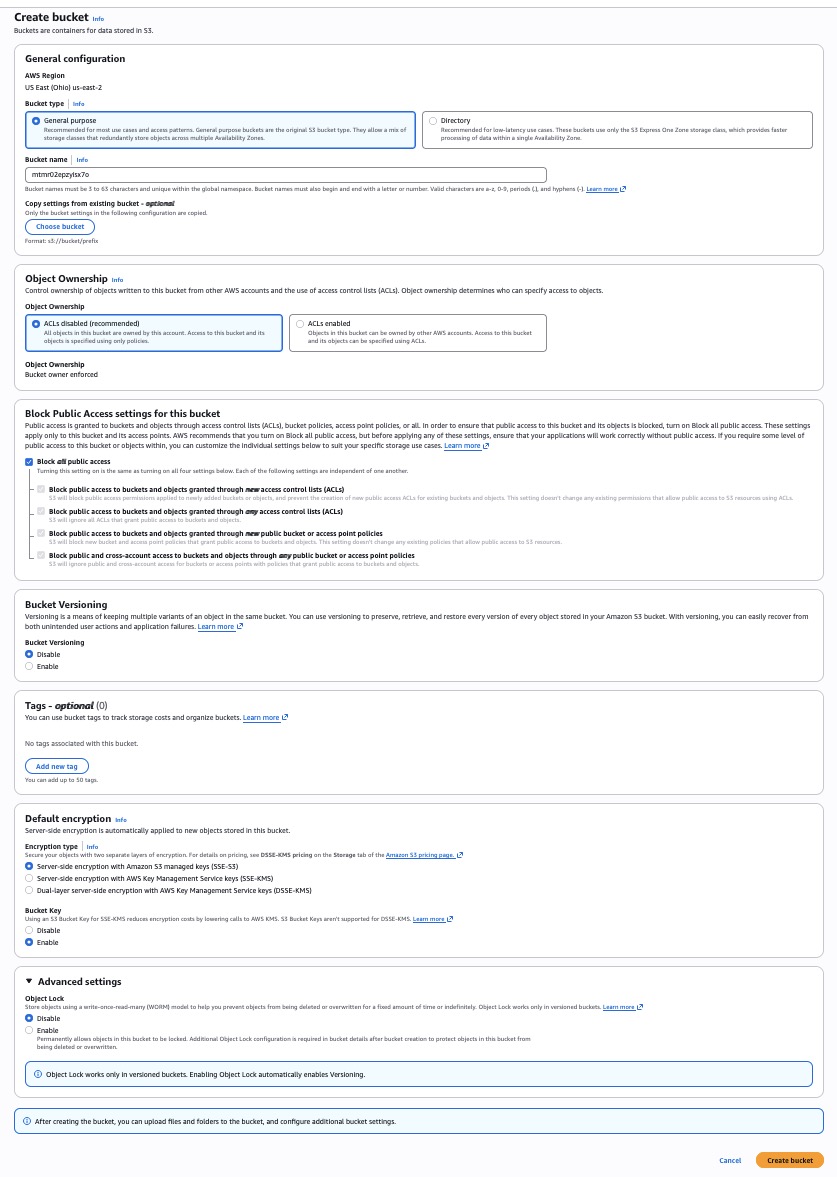 • Enable: S3 encrypts objects at rest (SSE-S3 or SSE-KMS).Advanced → Object Lock