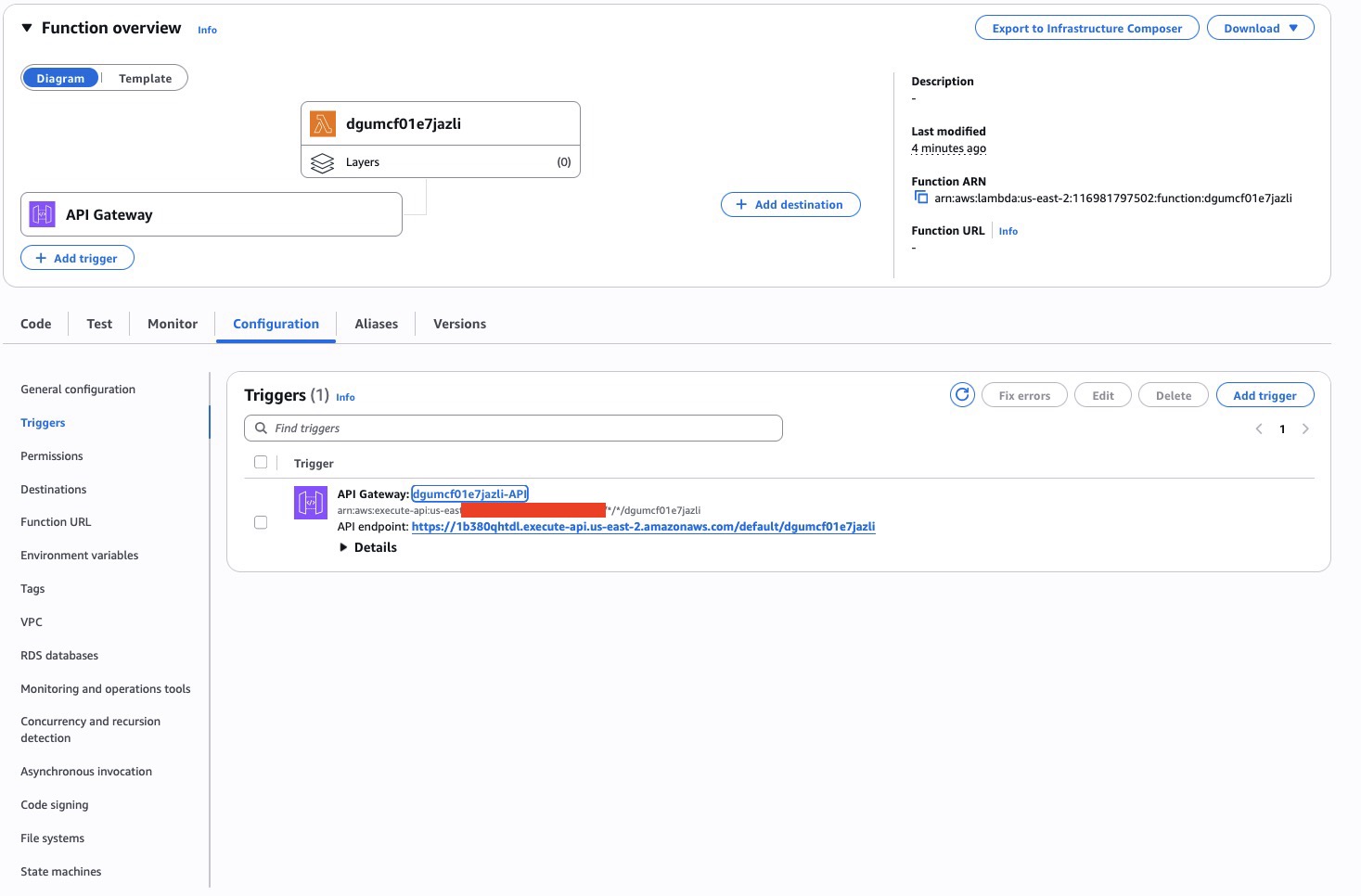 You should now see an API Gateway trigger box on the Lambda page. Open it to find the Invoke URL; this is the URL PCIbex will call.