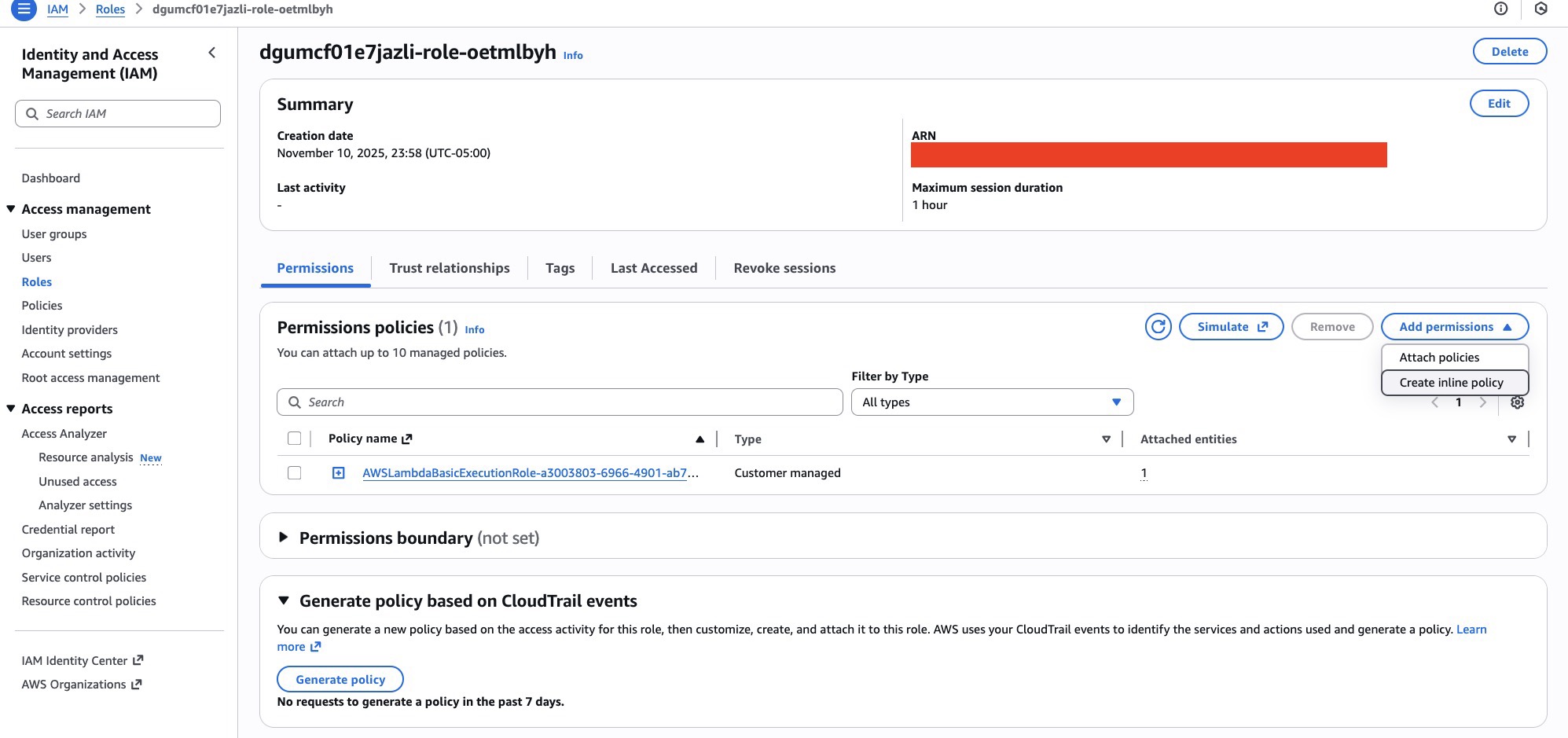 Back on the Lambda page: Configuration → Permissions → Role name (click it to open IAM).