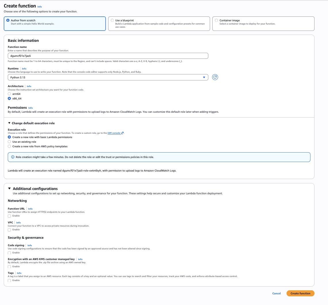 - Additional config: Function URL (not needed here), VPC (skip unless needed), code signing, KMS encryption, tags.