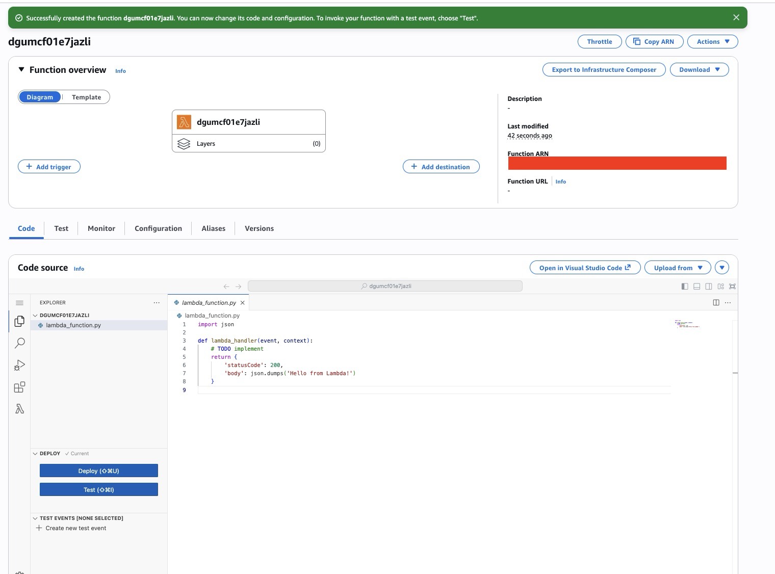 Click Create function. AWS creates the runtime + role and drops you into the editor.