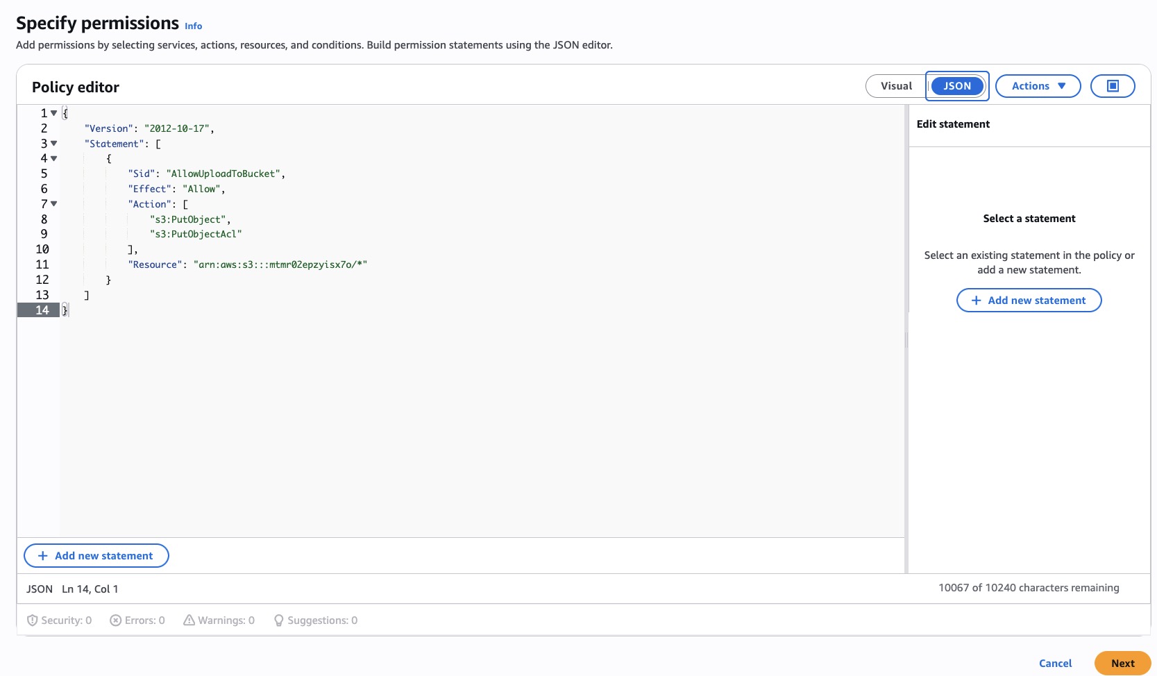 s3:PutObject(ands3:PutObjectAclif you need it) on your bucket’s objects by pasting the code in @json-iam.