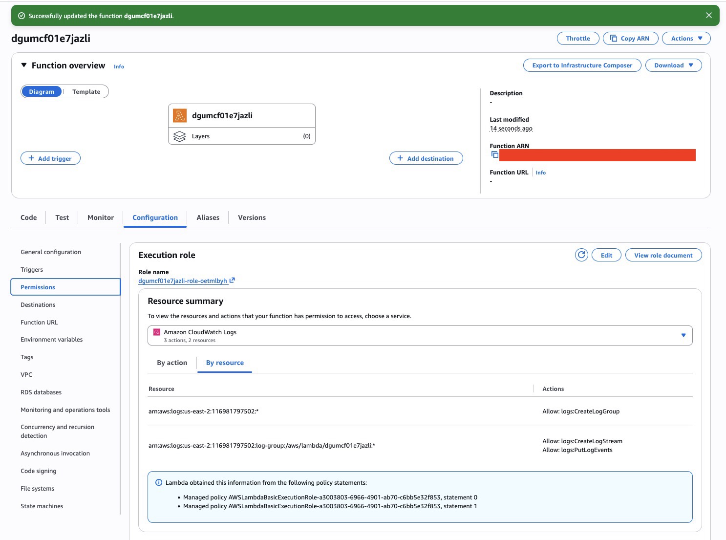 - Permissions: execution role (lets Lambda write logs, etc.).