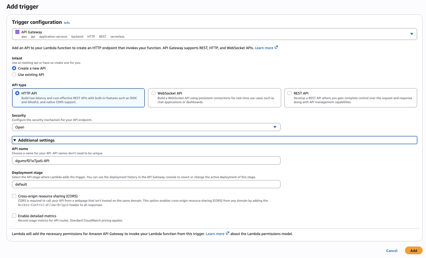 There’s also a link into the API Gateway console (we’ll use it for CORS next). Screenshot of the Lambda page with trigger: