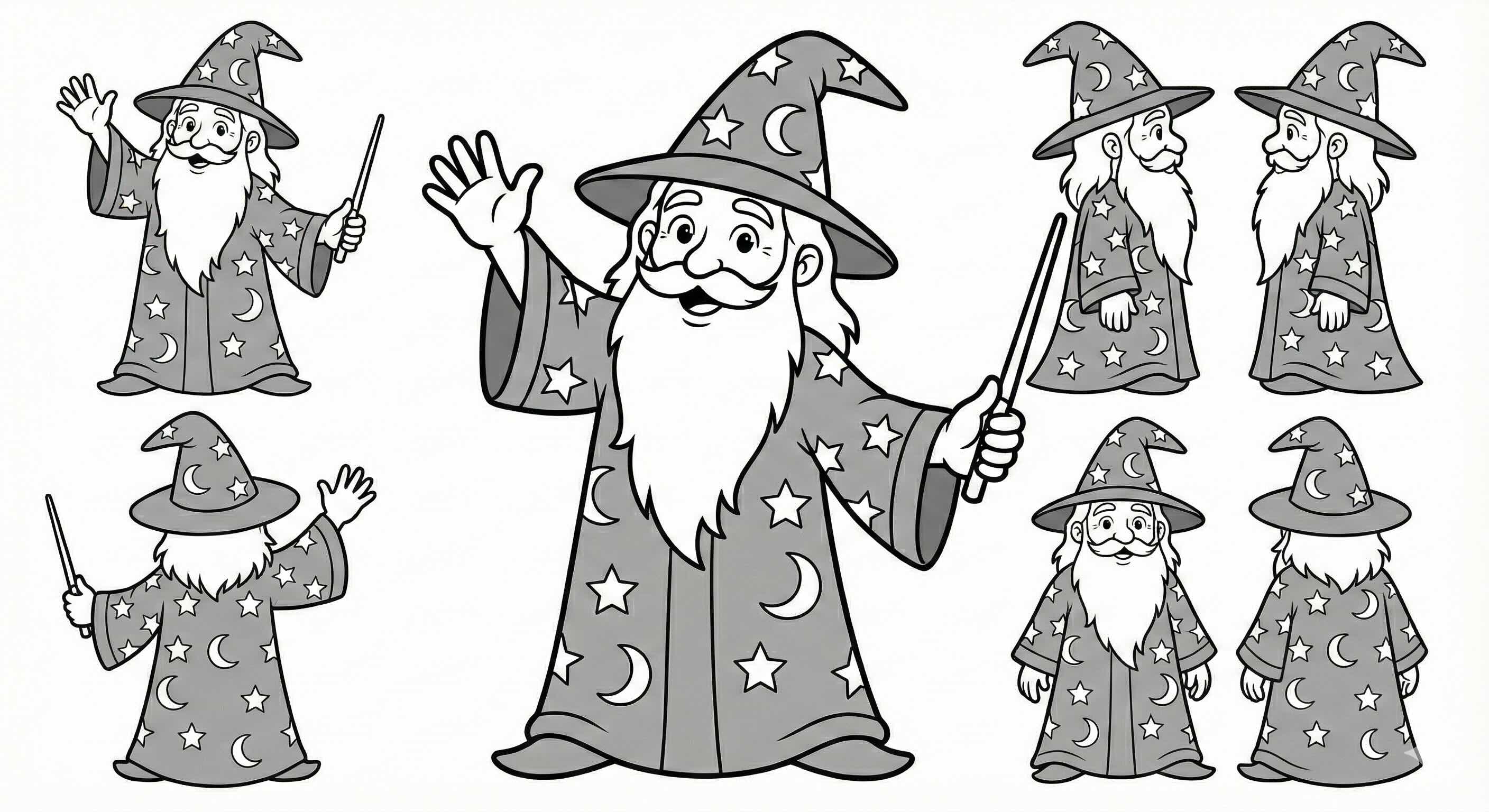 For my experiment, I needed: 1. 3 Characters: Wizard, Pirate, Chef. 2. 20 Actions: 10 regular verbs, 10 irregular verbs. 3. Strict Style: Clean black and white line drawings (coloring book style).