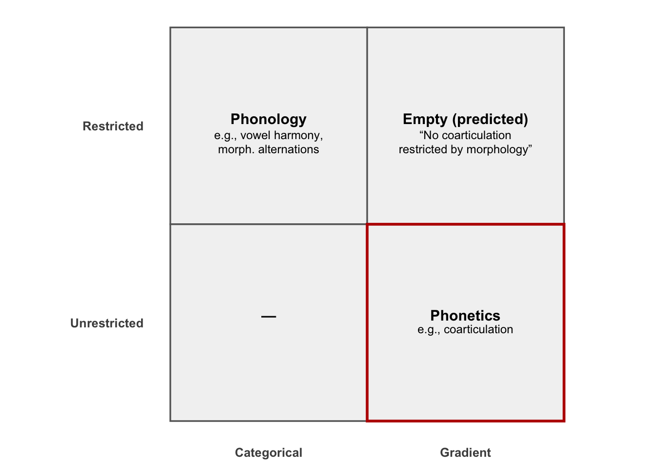 It’s a nice move because it comes with clear predictions. You shouldn’t get consonant copy or epenthesis as general phonotactic repairs, only as morphologically restricted alternations. You shouldn’t get morphologically restricted coarticulation. The grid is crisp: categorical + restricted = phonology, gradient + free = phonetics.